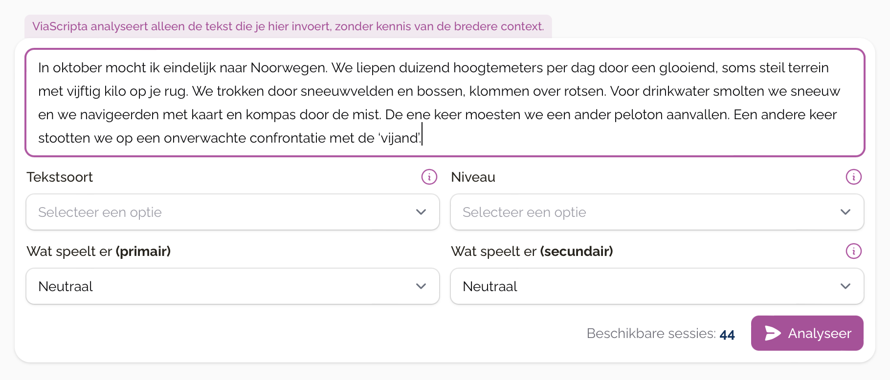 Kies je tekstsoort, stel je niveau in, kies wat er speelt en druk op “analyseer”.